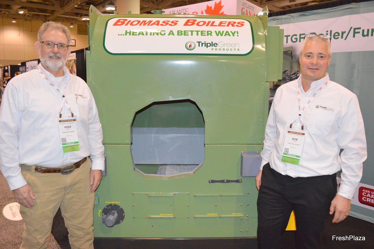 Triple Green Products Mike Kinsey, Rob Horst says their biomass boilers are used on farms for heating.