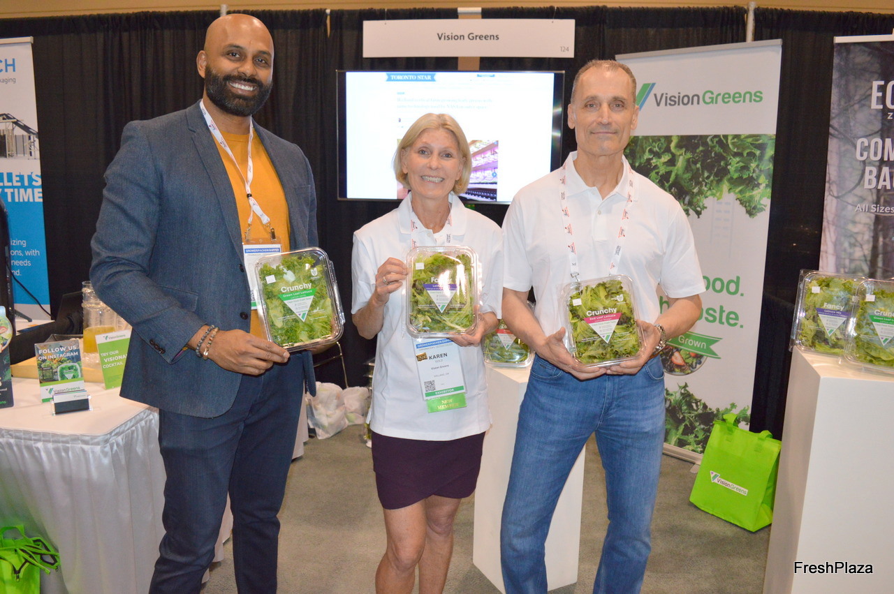 Vision Greens Lenny Louis Ceo, Karen Gold and Walter Villa showing their leafy greens produced in the vertical farm.