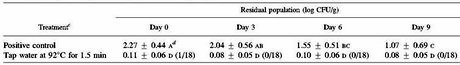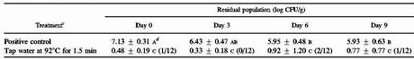 Residual population of Salmonella Poona RM 2350 on rind of treated and nontreated artificially inoculated cantaloupes that were stored at 4°C for up to 9 days. Click here to enlarge the table.
