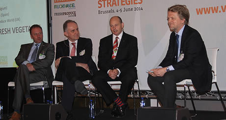 A panel discussion about the vegetable market: Filip Fontaine (BelOrta), Enrique de los Rios (Unica, Spain) and Andrew Burgess, of Produce World (UK). Chris White moderates the discussion.