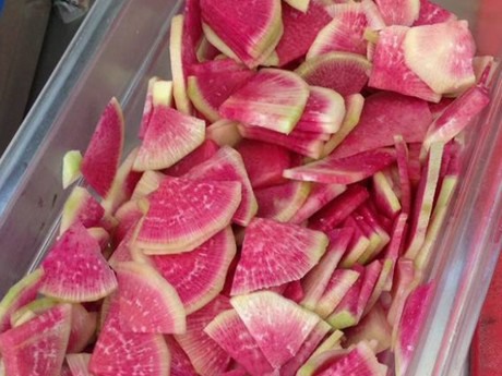 Watermelon radish is a gourmet product of Chinese origin that is currently being produced in very few parts of the world, as this culture needs special weather conditions and producing it has a high cost. It's consumption, however, has become popular in North America and Europe in recent years.