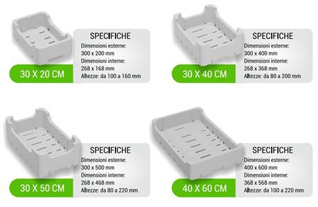 Crates are available in the 30x20 30x40 30x50 and 40x60 formats and have rounded corners to avoid cutting the fruit.