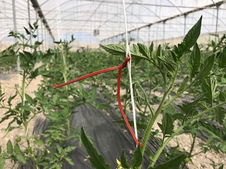 Pheromone dispenser must be installed just before transplants. They are made up of two plastic parallel micocapillaries - one contains the Tuta absoluta pheromone mix, while the other contains an aluminium wire to secure it to the support.