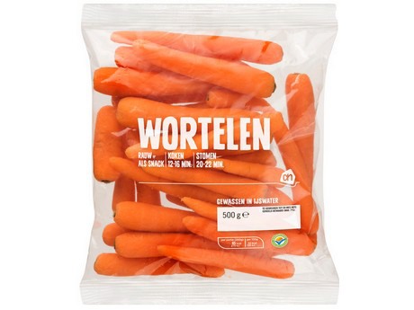 The Katwijk Washed carrots Centre offers washed carrots in different sizes. The cut carrots are sold in 150 gr, 300 gr en 500 gr packets. Weekly, the Katwijk Washed carrots Centre supplies a total of 150 000 kg of carrots to Vezet.