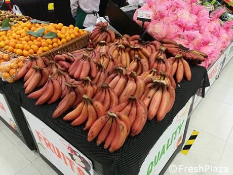 The small characteristic red bananas were displayed in a greengrocer's located in one of the city's main streets and were sold at 24 Renminbi per bunch.
