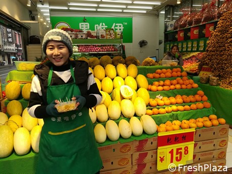 Clementine tangerines were sold loose (photo above), while packaged ones were sold at 28.80 Renminbi a packet (8 fruits = 3.7 Euro).