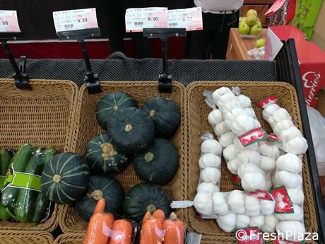 Courgettes were available in 500 gram packets sold at 13 Renminbi, while Chilean blueberries were sold at 32 Renminbi for a 125 gram punnet.