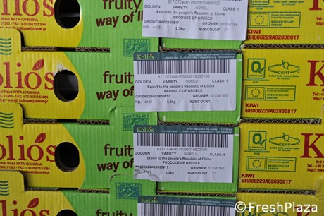 Table grapes from California were sold in 8 kg packets at €35/box. Greek kiwis cost 130 Renminbu per 3 kg box, meaning the price per kg was approximately €5. Single fruits will be sold at €1 in supermarkets.