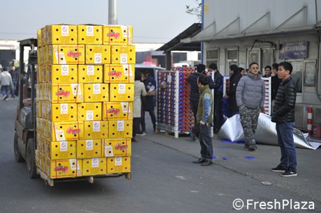 We had a chance to discuss the prices directly with wholesalers. A 5 kg box of Chilean cherries cost 600 Renminbi, i.e. €90 (equivalent to €18/kg). The produce was transported by air otherwise, by ship, the price would have dropped to €12/kg.