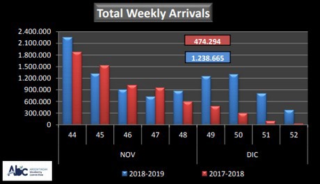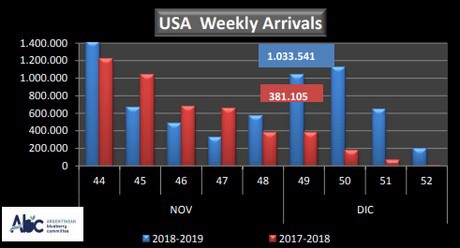 While Chile is now starting its peak season volumes, Argentina is slowly decreasing its export volume. As shown in the graphics below, there has been a rebound in exports during week 49 and week 50 in the total weekly arrivals. However, especially in the US markets, it’s expected to decrease quickly in the coming two weeks.