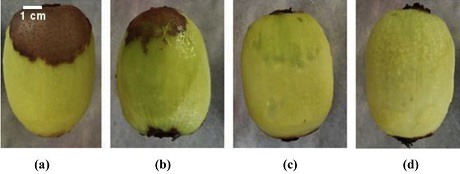 Photos of kiwis peeled with the Lye-peeling method with different immersing times: 3 min (a), 3.5 min (b), 4 min (c) and 4.5 min (d).