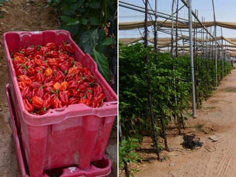The Israeli export company, Arava Export Growers, exports fresh Israeli produce worldwide. One of these is chilies. A couple of this company’s farmers have two hectares of their farm in the Arava Valley of habanero chili peppers growing in net houses.