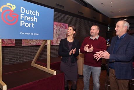 Tanja de Jonge, chairperson of the GRNR (Gemeenschappelijke Regeling Nieuw Reijerwaard, or Common Scheme of Nieuw Reijerwaard), Henk van Os, member of the EC of the GRNR, and Gerrit van Gelder, manager of Van Gelder Groente en Fruit, have given the starting sign for implementing the new mutual brand strategy of the three industrial estates. Van Gelder Groente en Fruit is the first company to be located at the expansion of Dutch Fresh Port (at the Nieuw Reijerwaard site in Ridderkerk). Together, they unveiled the logo of the new industrial estate.