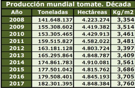 According to data from Hortoinfo, supplied by Faostat, 182,301 million kilos of tomatoes were cultivated worldwide in 2017, which meant that a historic record was reached. Production has increased by 35.76% over the past 10 years.