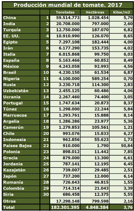 In 2017, Spain grew 4 times as many tomatoes as Morocco and 5.5 times more than the Netherlands. Turkey grew twice as much as Spain. China, the number one producer in the world, grew 11.5 times more than Spain. The total world production amounted to more than 180,000 million kilos, grown on an area of almost 5 million hectares.