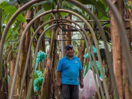 Hugo Rocafuerte Vera inspecting banana trees (Photo: Carson Ingley and Brendan Pate)