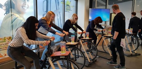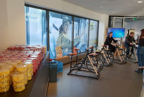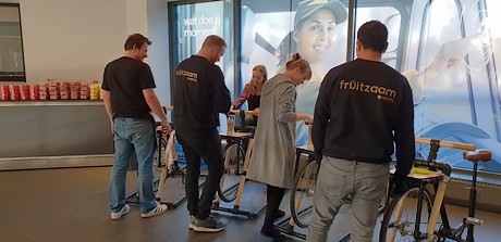 Employers can combine their work fruit subsciption with all kinds of events, workshops or programs. For example, Fruitzaam Events recently held a clinic for 1.400 people employed in the Dutch Randstad area. Here, the participants got to mix their own smoothies by pedaling a bicycle.