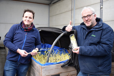 Grower, Jean-Pierre van Wesemael from the Dutch company, Saeftinghe Zilt, and Elenbaas Zeegroenten's Hans Elenbaas. Here, they are standing at the sea kale's cultivation boxes.