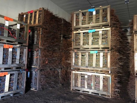 "The trees are dug, graded, and sized during dormancy in very early spring and then placed on individually numbered nursery pallets and transferred to our storage facilities in Yakima, WA. Our cold storage rooms are spread with sawdust to maintain humidity and the pallets are stacked four high in order to maximize our space. Being that the pallets are individually numbered, we are able to inventory the specific size, variety, and rootstock of each pallet, and know exactly where such trees are located within our facility. Trees are inspected daily to ensure that adequate airflow is being applied to the roots in order to prevent any desiccation from stagnation while awaiting shipment. The trees are also watered on a daily basis in order to prevent any dehydration within the plant. Plants are handled a minimum number of times between the grading tables and staging of orders in order to minimize any possible damage."