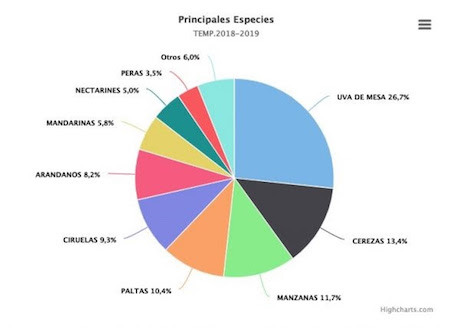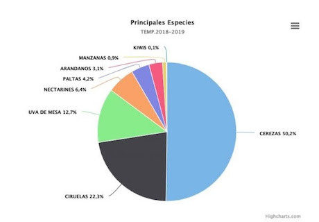 The main fruits exported to date are: table grapes, cherries, apples, avocados, plums, and blueberries. Plum exports present the biggest increase, as exports of grapes, cherries and apples have been lower than in the previous season.
