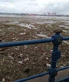 Debris, consisting of a huge amount of plastic waste, covers the sea surface in the harbour (photo right) and frames much of the coastline.
