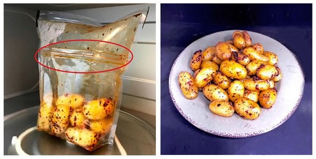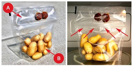 A: compartment for spice mixture; B: compartment for potatoes or other vegetables. When heated, the seam between the two compartments opens.