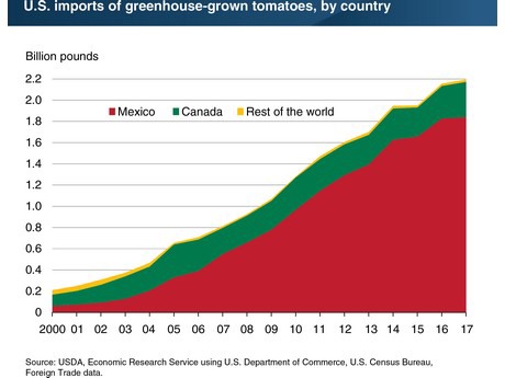 In 2017, imports from Mexico accounted for almost 84 percent (1.8 billion pounds) of the greenhouse-tomato volume coming into the U.S. market. Imports of Canadian greenhouse-grown tomatoes have remained at about 300 million pounds.