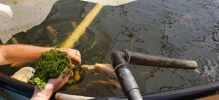 The fish come when he whistles, Colin says, as he scoops a handful of duckweed from the surface of the deepwater beds for them