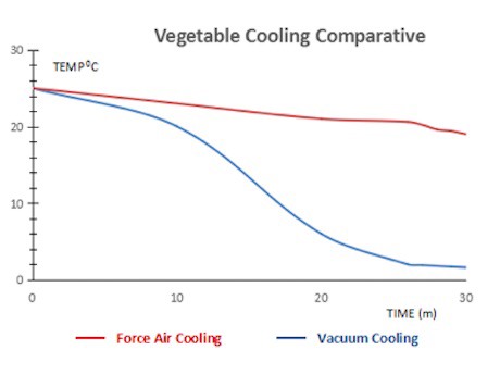 "Vacuum cooling is the quickest known method for pre-cooling fruit and vegetables. This method improves the product quality and extends the shelf-life of fruit and vegetables. Furthermore, this method lowers the overall cost of the cooling process. The advantages of this method include the following: quick and even cooling, and highly effective. This method maintains the freshness of the product. Furthermore, this method is suitable even for fruit and vegetables harvested under poor weather conditions (such as rain). Disadvantages include the following: this method is extremely suitable for leaf vegetables, mushrooms, peppers, corn, and strawberries, but not for some of the thicker, sturdier fruit and vegetables such as mangoes, carrots, and tomatoes."
