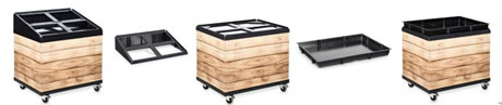 The Mobile Presentation Island (MBI) lets retailers present fruit and vegetables in plastic, cardboard or wooden trays. It is also suitable for all standard packaging sizes. Users can adjust the system to meet their requirements. All they need to do is exchange the cardboard boxes in the frames. They are then ready for a new season or campaign. The island can be entirely disassembled. It takes up very little storage space.