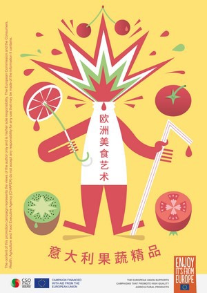 Mr Good Fruit is an imaginary character that was born from the combination of the fantastic products that will be presented and promoted by the project. Among these, kiwis and red oranges stand out, along with many other products that characterize the range of European fruit and vegetables on offer (from cherries to tomatoes, not to mention apples and pears, and the large variety of vegetables) as well as processed products from fruit juice to tomato puree, and the many vegetables that are preserved and which maintain their healthful characteristics. The original, colourful style which portrays Mr Good Fruit in the cartoon version with predominantly red and yellow hues, wishes to celebrate the Italian tradition and its meeting with the Asian style and motifs. Furthermore, it fully represents the craft skills and Italian artistic creativity.