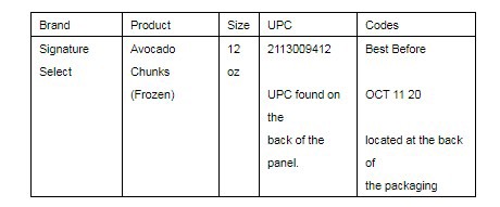 Nature's Touch is voluntarily recalling Signature Select Avocado Chunks, with a best before date of Oct 11, 20, due to potential contamination with Listeria monocytogenes (the "Product").