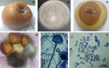 Rhizopus oryzae on apple. (a) Soft rot symptoms on fruit collected from local markets, (b) isolate growing on PDA for 3 days at 25 °C, (c) soft rot symptoms on incubated fruit after 2 days incubation, (d) soft rot symptoms on incubated fruit after 7 days incubation, (e) sporangiophore bearing a sporangium, (f) sporangiospores.