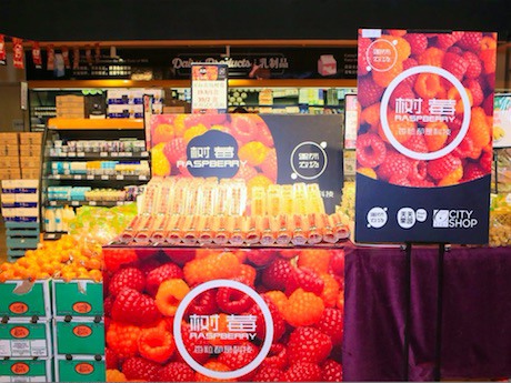 Special retail counter for Interstellar Farm raspberries at City Shop in Fangcaodi Mall, Beijing
