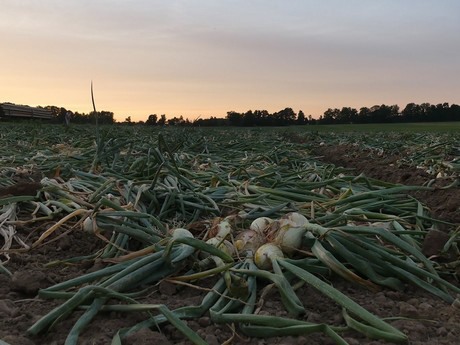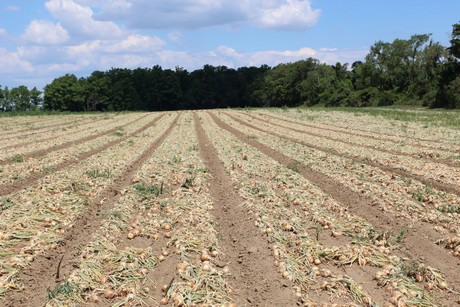 "What we are seeing is a good crop, with quality and condition remaining excellent," Woods said. Producers like Gwillimdale Farms first top the onions before digging them back into the soil to cure. They then return one week later to harvest the cured onions and send them off to the packing house.