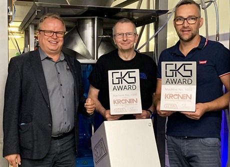 In the Swiss village of Eggenwil, fresh fruits and vegetables are packed by a GKS CP 350 PLUS with the serial number 1000. On this occasion, Kronen managing director Stephan Zillgith attended the commissioning of the machine and presented managing director of Guggisberg Agro AG, Paul Guggisberg, and David Freund of Seda-Freund AG, the official Kronen representation in Switzerland, with the GKS award for the machine with the four-digit serial number.