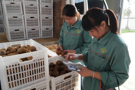 "Shaanxi is one of the major kiwi fruit production areas in China. Mei county is located in the foothills north of the Qinling mountains. This area is commonly regarded as the optimum area for the production of kiwi fruit. The geographical location and the weather conditions are all perfectly suitable for the growth of green kiwi fruit. The main product varieties cultivated in this area are the late-season Hayward kiwi fruit, and the Xuxiang kiwi fruit which is sweet with a slight hint of sour. The harvest season of the mid-season Xuxiang varieties begins around August 25th. The freshly harvested kiwi fruit undergo selection and processing before they make their way to the market."