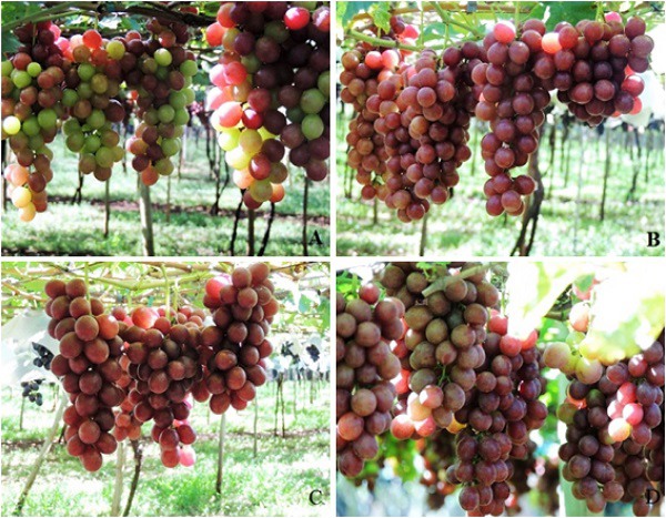 Bunches of Benitaka table grape treated with (S)-cis-abscisic acid (S-ABA 400 mg/L) at different timings of ripening. A: Control (no application); B: At pre-veraison; C: At veraison; D: at post-veraison. A second application of S-ABA 400 mg/L was performed for all treatments 10 days after the first application, except for the control.