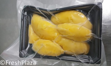 "This year, up until now, our company has imported more than 280 tons of whole Musang King durian cooled in liquid nitrogen. That is an increase of 11.8% in comparison with last year. We sell the imported durian directly to wholesale markets, e-commerce platforms, and supermarket chains. Our retail network covers all the first- and second-tier cities in east China. We mainly package the refrigerated durian pieces per 250 grams, 300 grams, and 400 grams, but we also sell whole Musang King durian pre-cooled in liquid nitrogen. The whole Musang King durian weighs around 10 kg and the current market price is around 88-128 yuan [12.35-17.97 USD] per 0.5 kg depending on the quality," explained manager Yang.