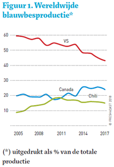 After the US, Canada and Chile are the largest producers of blueberries. There is also a significant expansion of this product's acreage in Europe. Between 2012 and 2016, this grew by 65%, and production almost doubled.