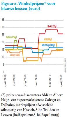 The thesis also focused on store prices for blueberries in Belgium. Those between April 2018 and April 2019 were considered. In Figure 2, you can see Delhaize and Albert Heijn's prices are relatively consistent. Those of Colruyt, Aldi, and the weekly market fluctuate more over a year.