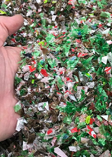 It led to the idea of giving use to this often landfilled type of plastic, shunned by many recyclers (especially coloured PET bottles) at the same time as wooden fruit pallets are climbing in price in the Western Cape. Now they remove 400 tonnes of plastic from the waste stream every month (right: plastic flakes to be turned into a pallet).