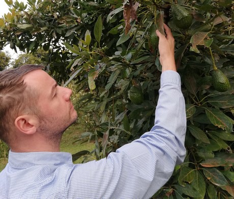 Steve Alaerts inspects an avocado in Michoacan Mexico