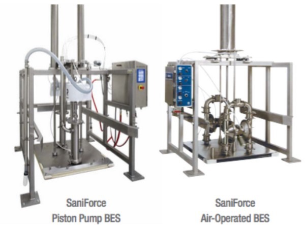The SaniForce Bin Unloader is a clean method to unload materials from 1192-liter containers, eliminating manual scooping or bin dumping. Without contaminating, diluting or heating the product, the unloader achieves up to 99% evacuation rates of high viscosity ingredients. Once the Combo Fructus is placed below the unloader, the ramp plate and pump is lowered into to the container, just above the product. The seal is inflated to hermetically seal of the bin. When the pumping starts, the product is moved out of the container and the plate with inflatable seal travels down into the container, scraping the product from the sides of the container. The product waste is minimal and the transfer perfectly hygienic.