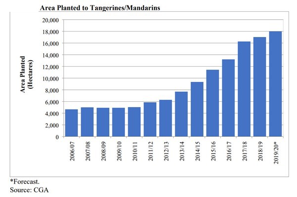 The production of tangerines/mandarins is forecast to continue its growth and is expected to increase by 8 percent to 420,000 MT in the 2019/20 MY, from 390,000 MT in the 2018/19 MY. The 2018/19 MY production of tangerines/mandarins was revised upwards significantly based on final updated industry data and higher than expected production some growing regions that were previously impacted by the drought, the USDA states.