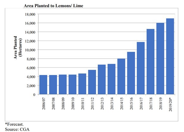 The production of lemons/limes is forecast to continue its growth and is expected to increase by 6 percent to 530,000 MT in the 2019/20 MY, from 498,000 MT in the 2018/19 MY. This is based on the rise in area planted, and the high level of new-plantings in the past five years coming into full production, according to the report.