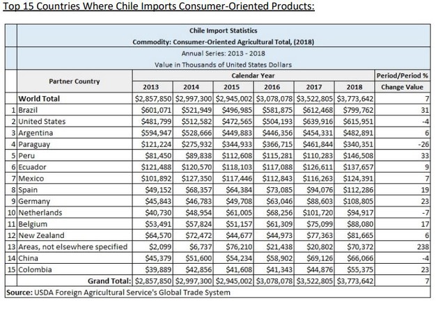Chile has a population of 18,8 million people. In 2018, it imported €9,880,000 worth of vegetables, €159,568,000 in fruit and nuts to the value of €31,989,000. Brazil, the United States, and Argentina are Chile's main exporters.