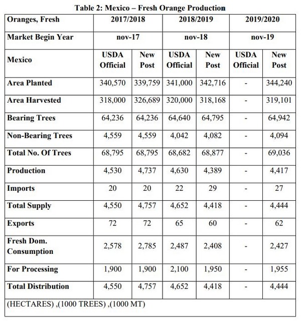 The 2018/2019 yields in other regions were somewhat low at 13,7 tons/ha. These low yields were caused by adverse weather conditions - high, dry temperatures. The yields for 2019/2020 are estimated at 13,9 tons/ha. In total, the Mexicans are expecting to harvest 4,4 million tons of oranges in the coming year.