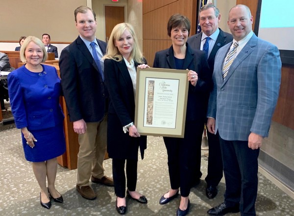 Mrs. Grimm-Marshall, Mrs. Grimm Anderson, Brandon Grimm and President Zelezny joined CSU Chancellor Timothy P. White at the podium for remarks and the presentation of a resolution honoring the Grimm family’s generous gift.