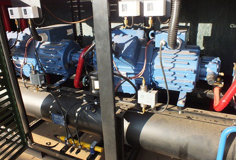 Two compressors in a multiplex installation (photo: Rhodes Abell, Refrigeration Specialists)